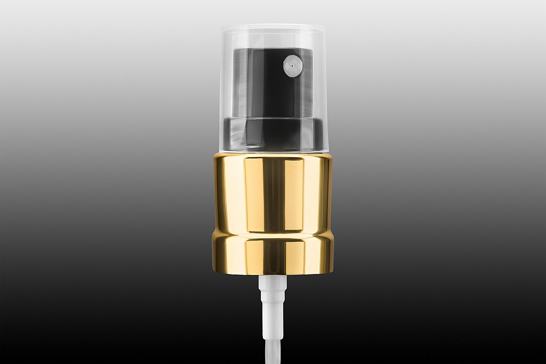 Atomizer o gwincie 18/415, z kołnierzem aluminiowym, gładkim, złotym, czarna pompka, długość rurki 115mm, nasadka transparentna