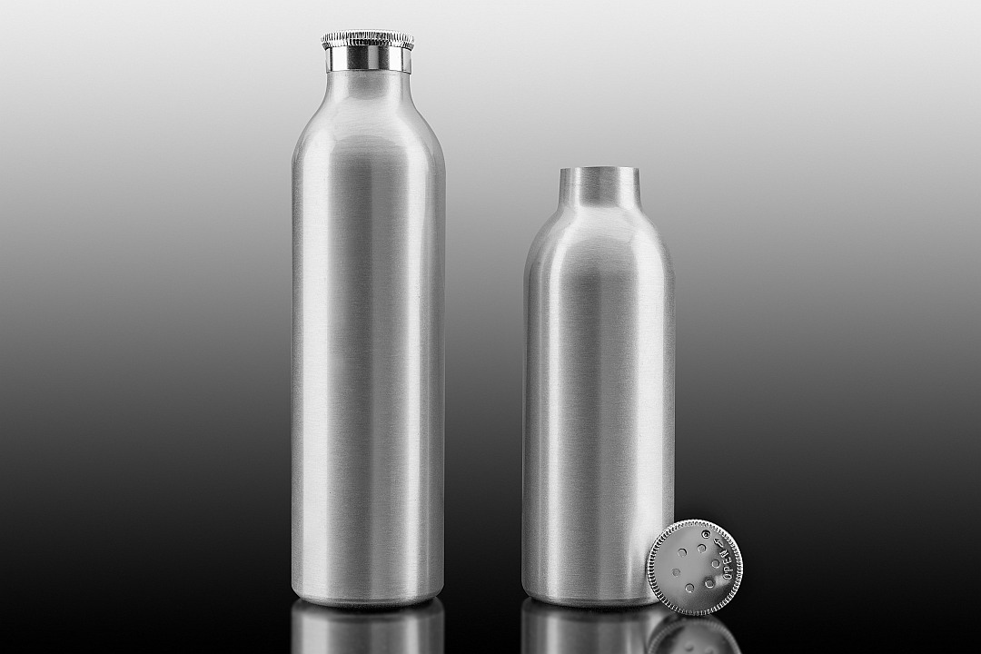 Butelka okrągła aluminiowa z nasadką-sitkiem o średnicy 26 mm
