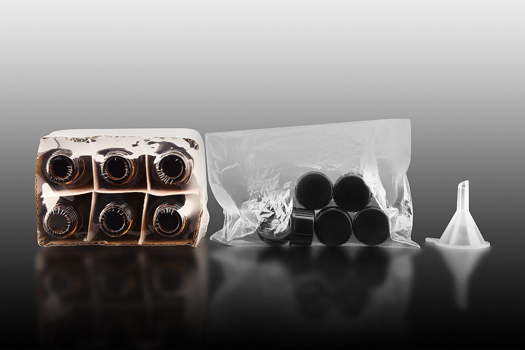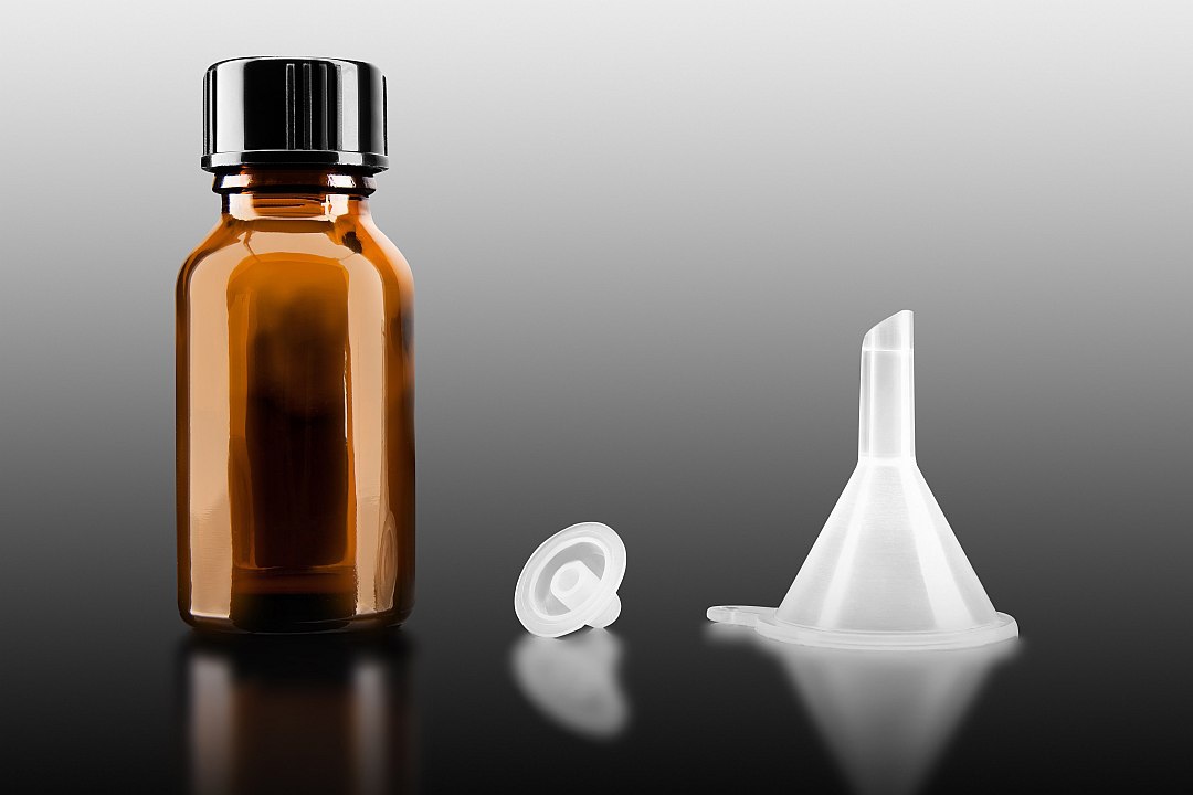Zestaw 6 butelek szklanych 15 ml z nakrętką PP z wkładką/zatyczką stożkową oraz z lejkiem