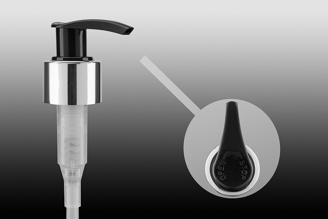 Pompka dozująca 24/410 z aluminiowym kołnierzem srebrny połysk, czarna pompka, rurka 118mm